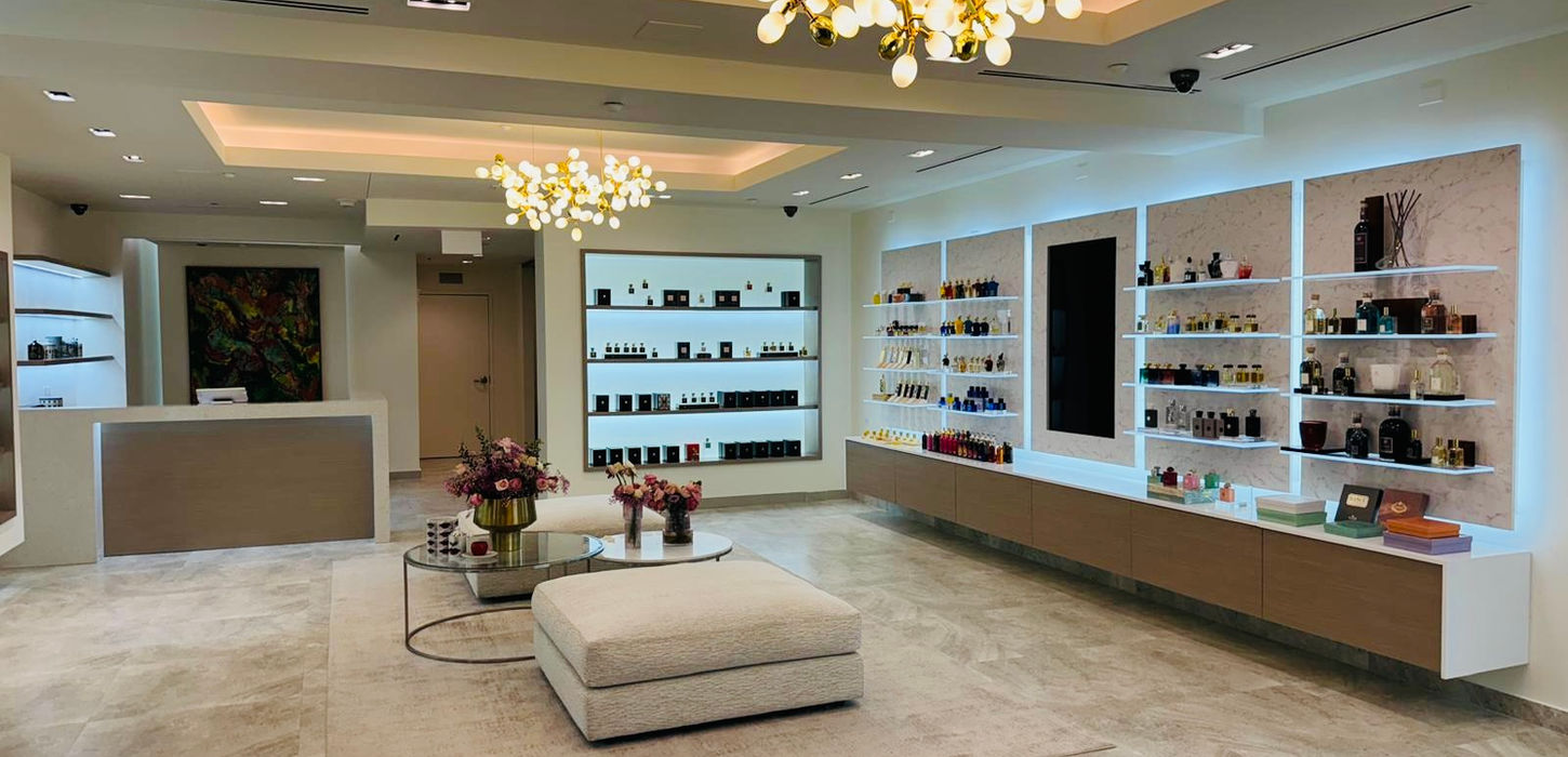 El diseño incorpora vitrinas de vidrio iluminadas cuidadosamente para transformar el almacenaje en toda una experiencia visual. El piso de mármol, la distribución estratégica y la integración de tecnología hacen que el espacio combine lujo, funcionalidad y modernidad en perfecta armonía.